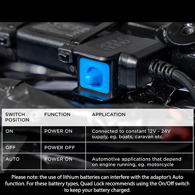 - Please note: Quad Lock recommends to use on/off switch with lithium batteries to avoid battery drain