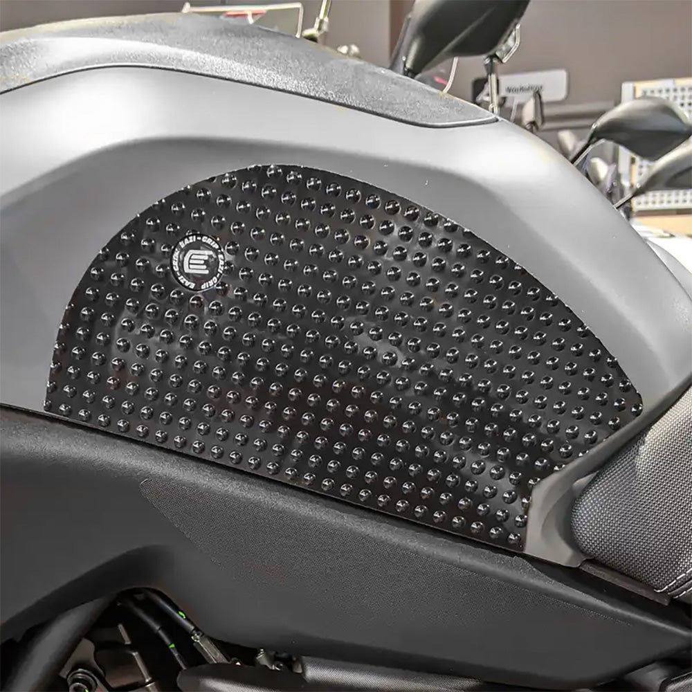 The ‘Evo’ series tank grip features pronounced hemispherical traction domes. Ideal for riders who want that added level of confidence by being able to feel the grip through their leathers. Available in Black and Clear.